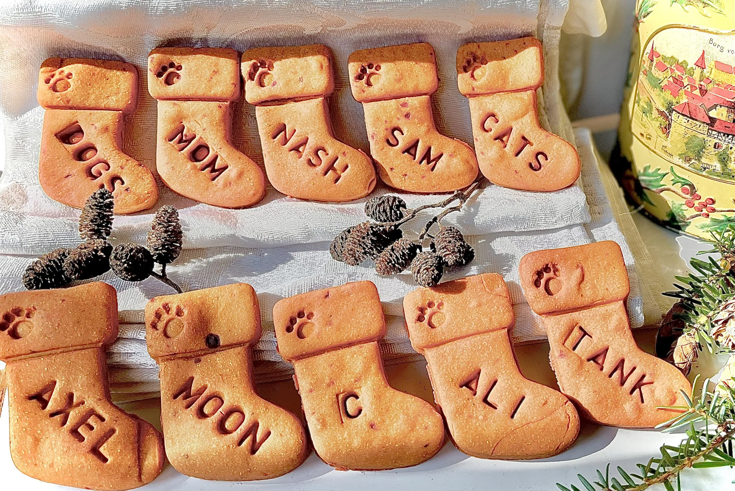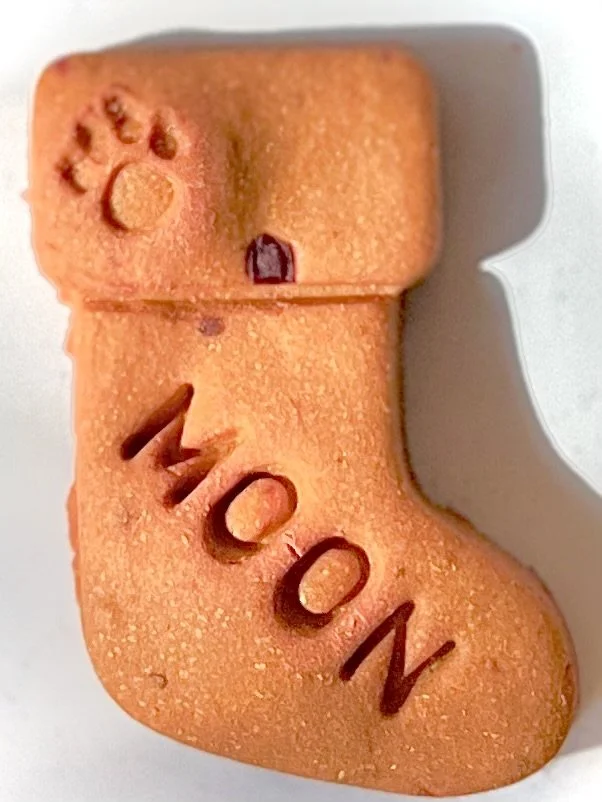 These grain free and gluten free cookies are handmade with all natural organic ingredients, no preservatives or artificial colors or flavors. They are made in small batches and individually stamped out and baked to crispness for your pooch.