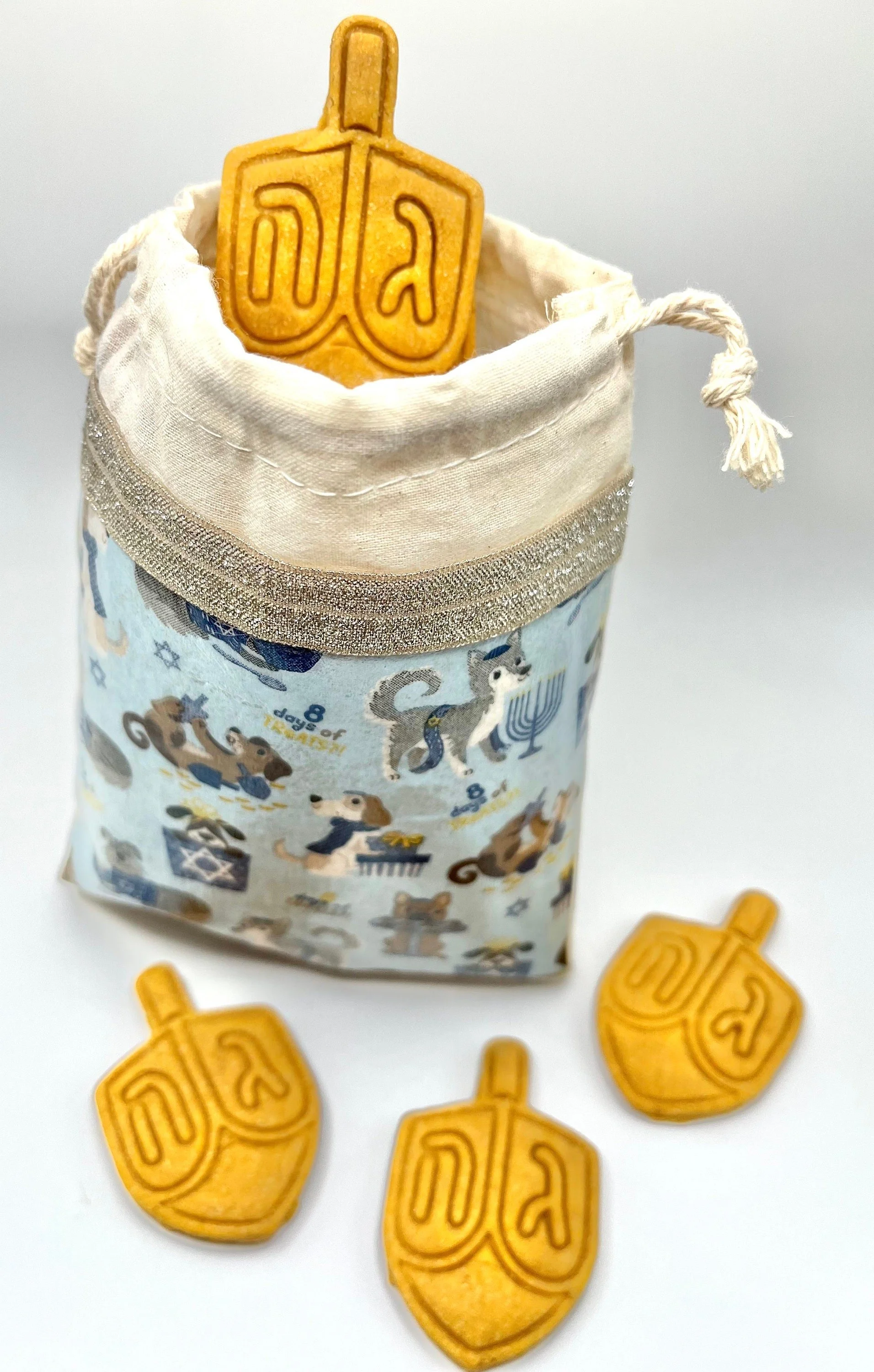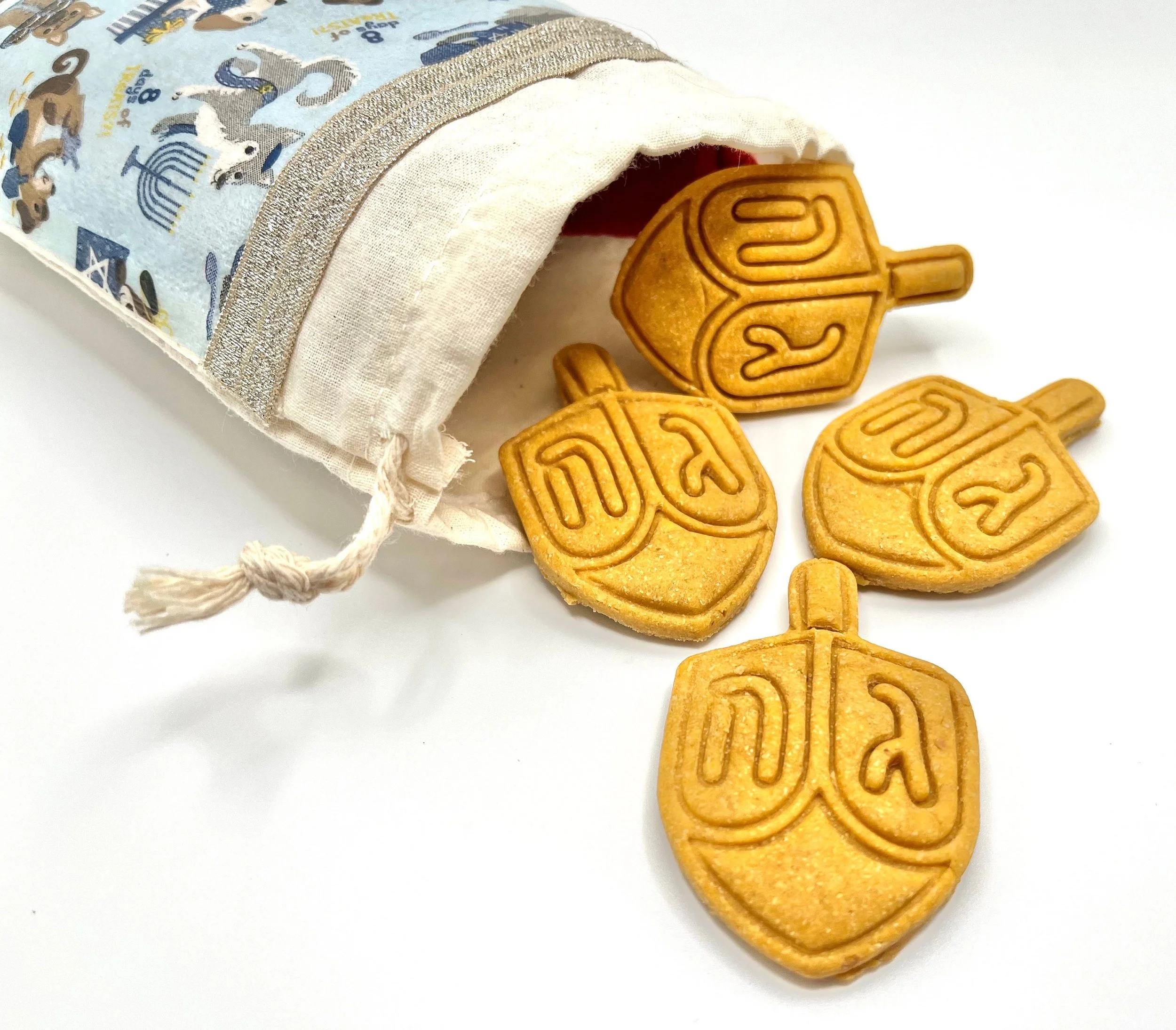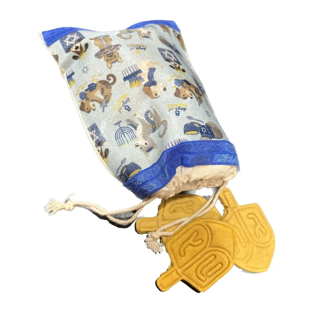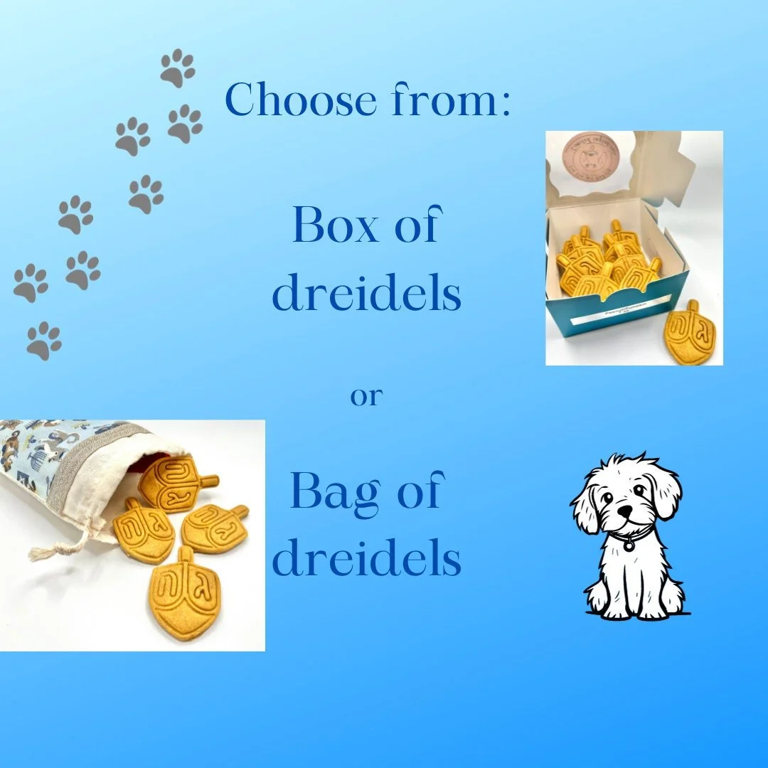 Choose from a 5 oz bakery box of dreidels or a handmade muslin bag full of dreidels. Treats have been dehydrated and have a softer texture for your dog.