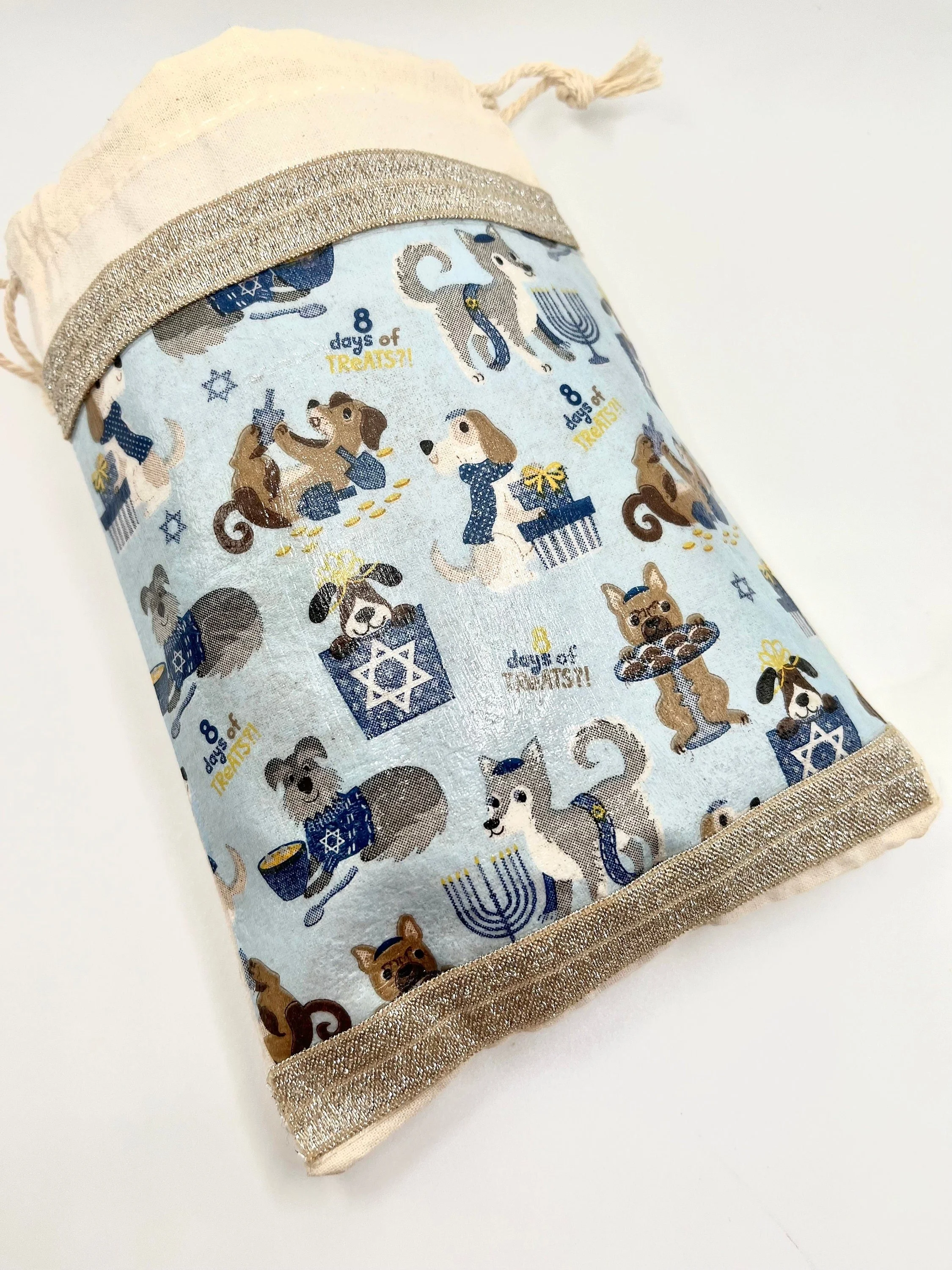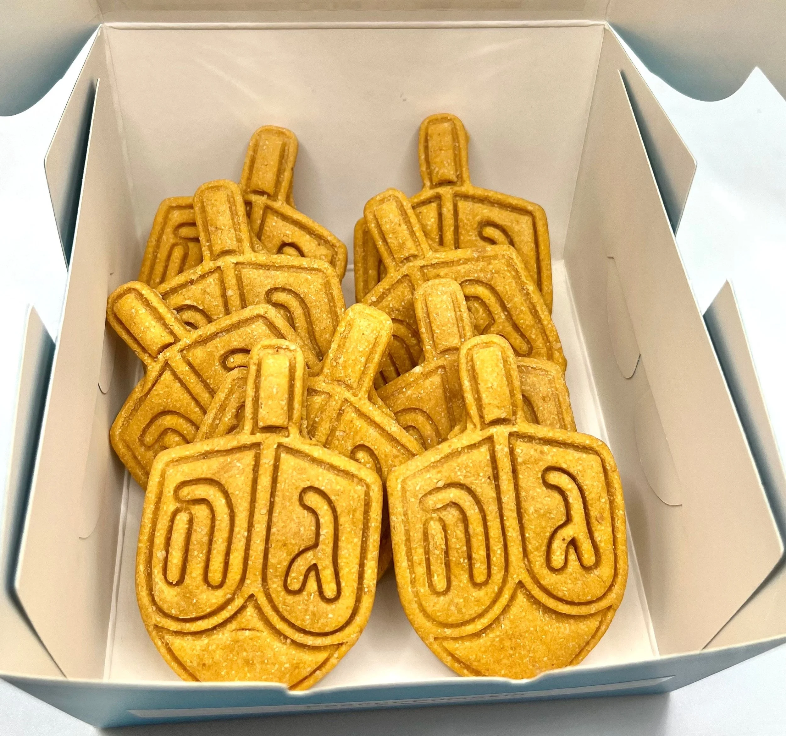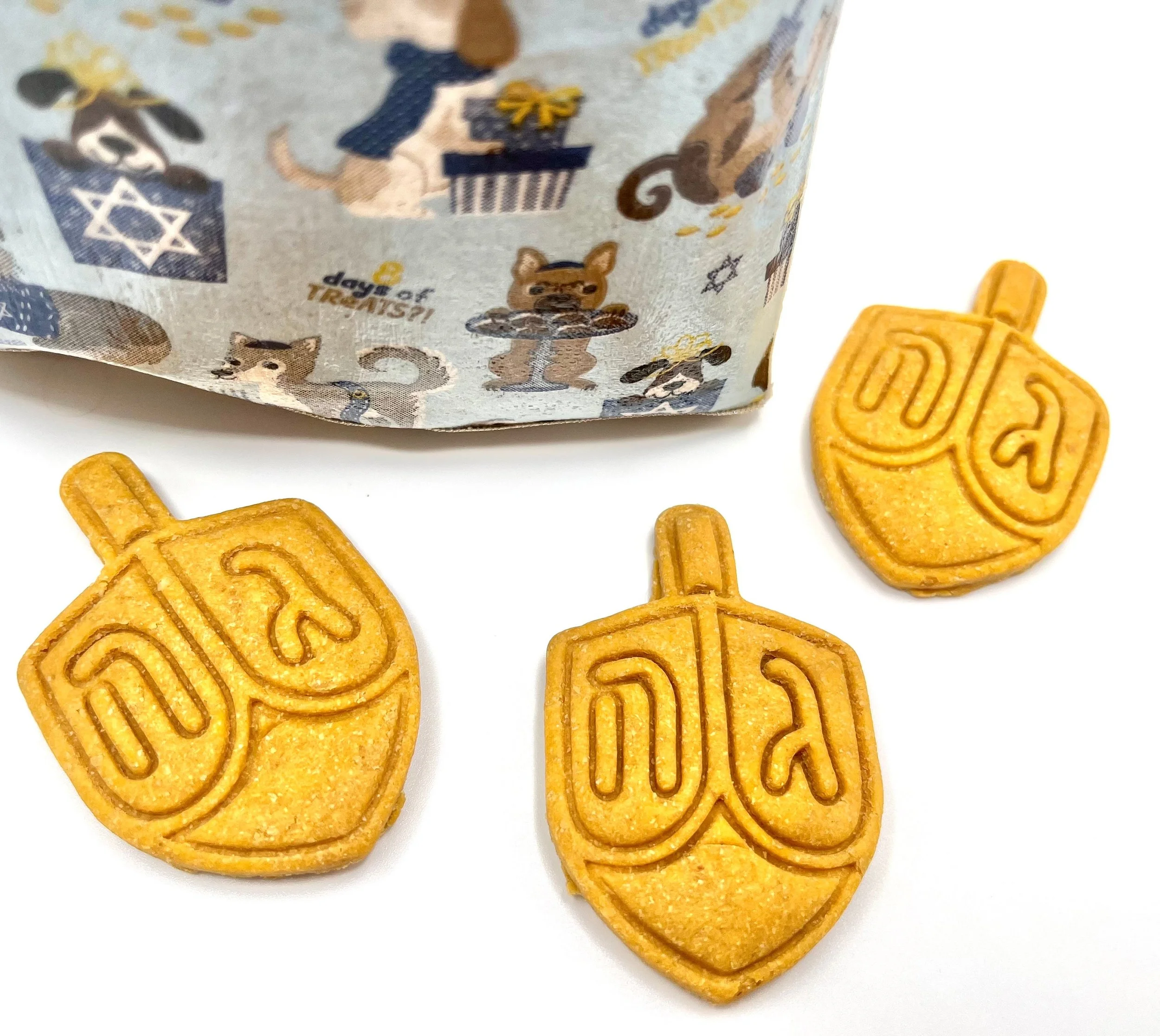 Choose from a 5 oz bakery box of dreidels or a handmade muslin bag full of dreidels. Treats have been dehydrated and have a softer texture for your dog.