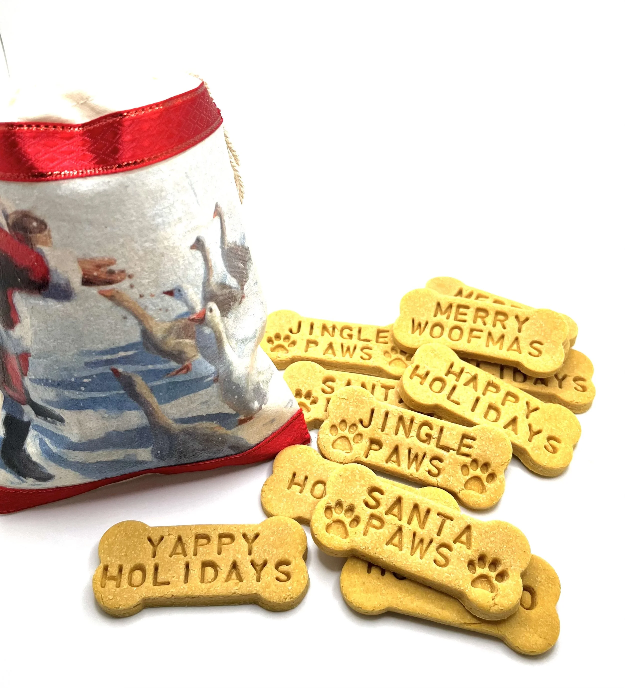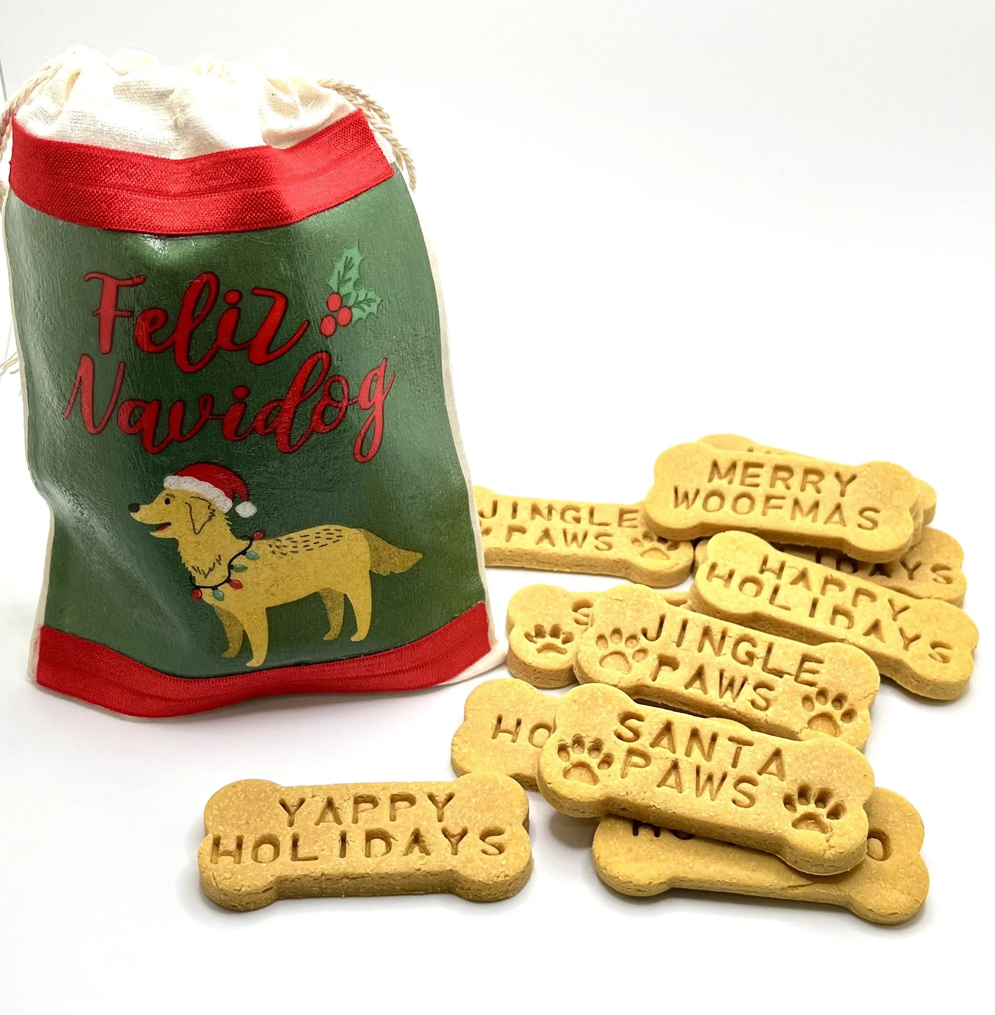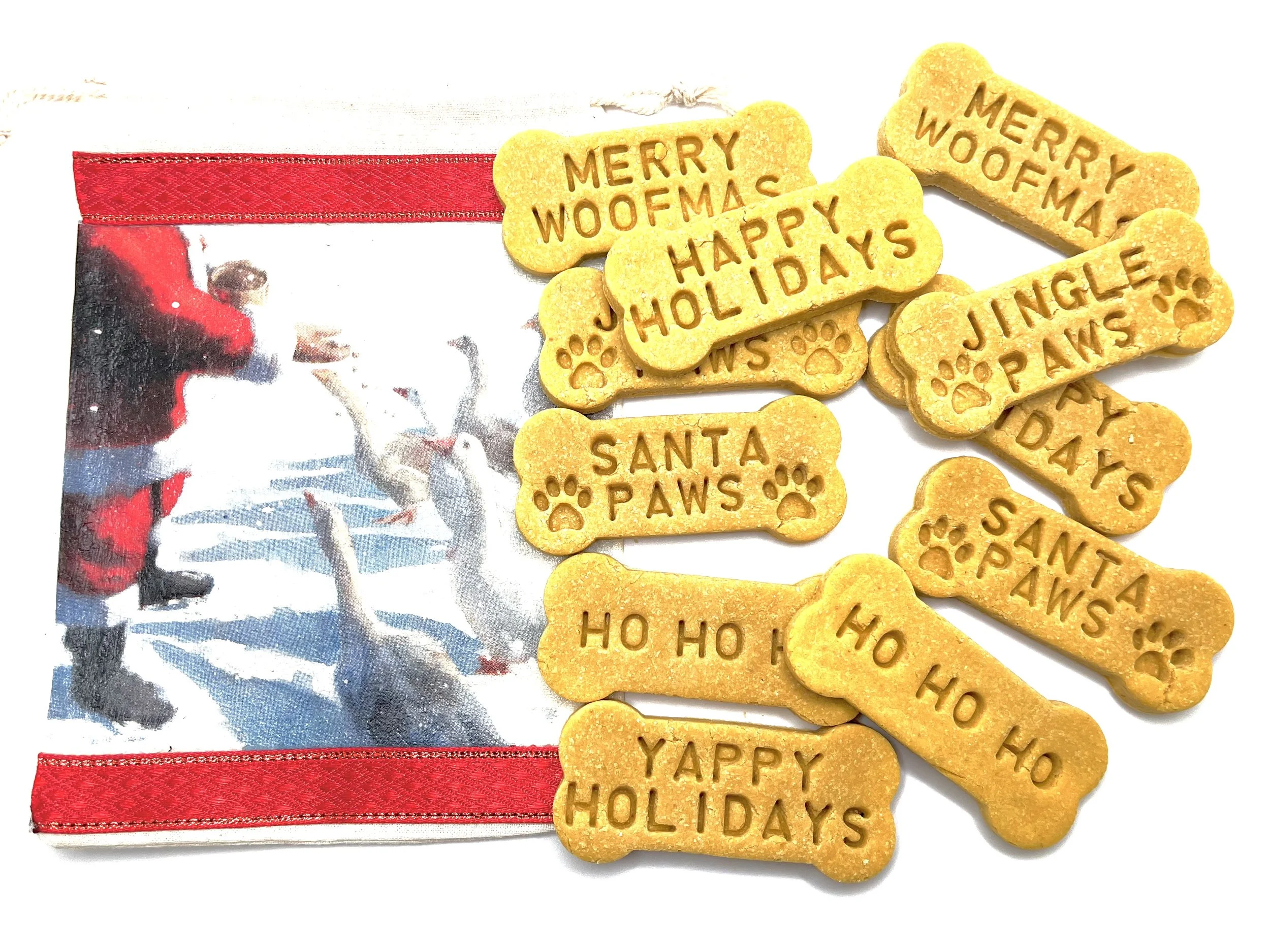Choose from an assortment of festive handmade decoupaged gift pouches this season. Each gift bag will contain 5 ounces of prestamped dog bones (photos). Each bone is 3 inches in size. These are a favorite with my dog and if you are looking for a high protein treat these are perfect. If you have an older dog these have a softer texture for easier chewing and easily break apart.