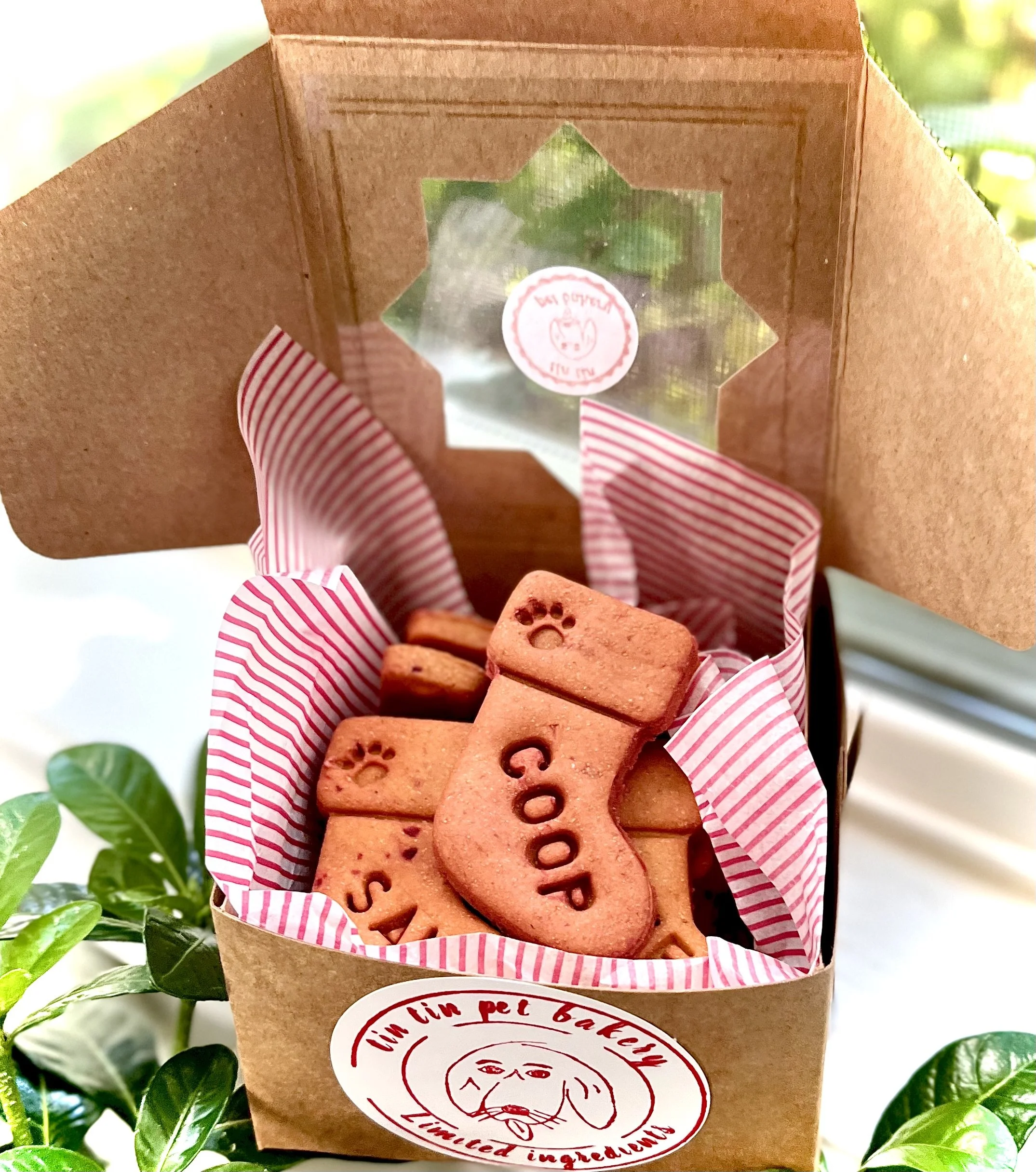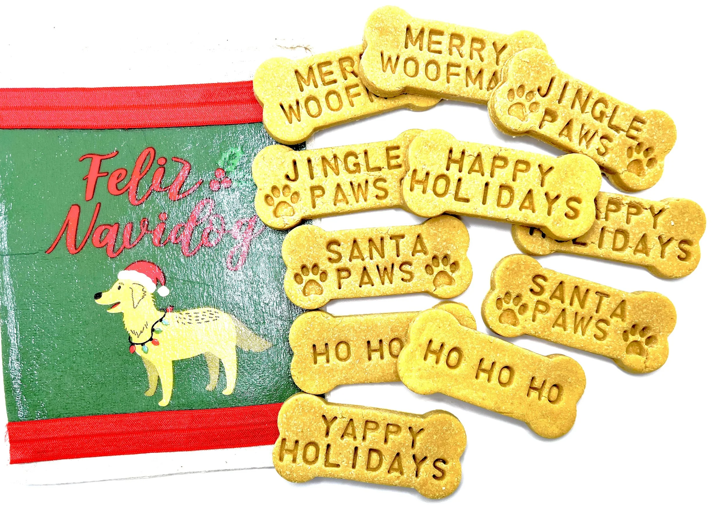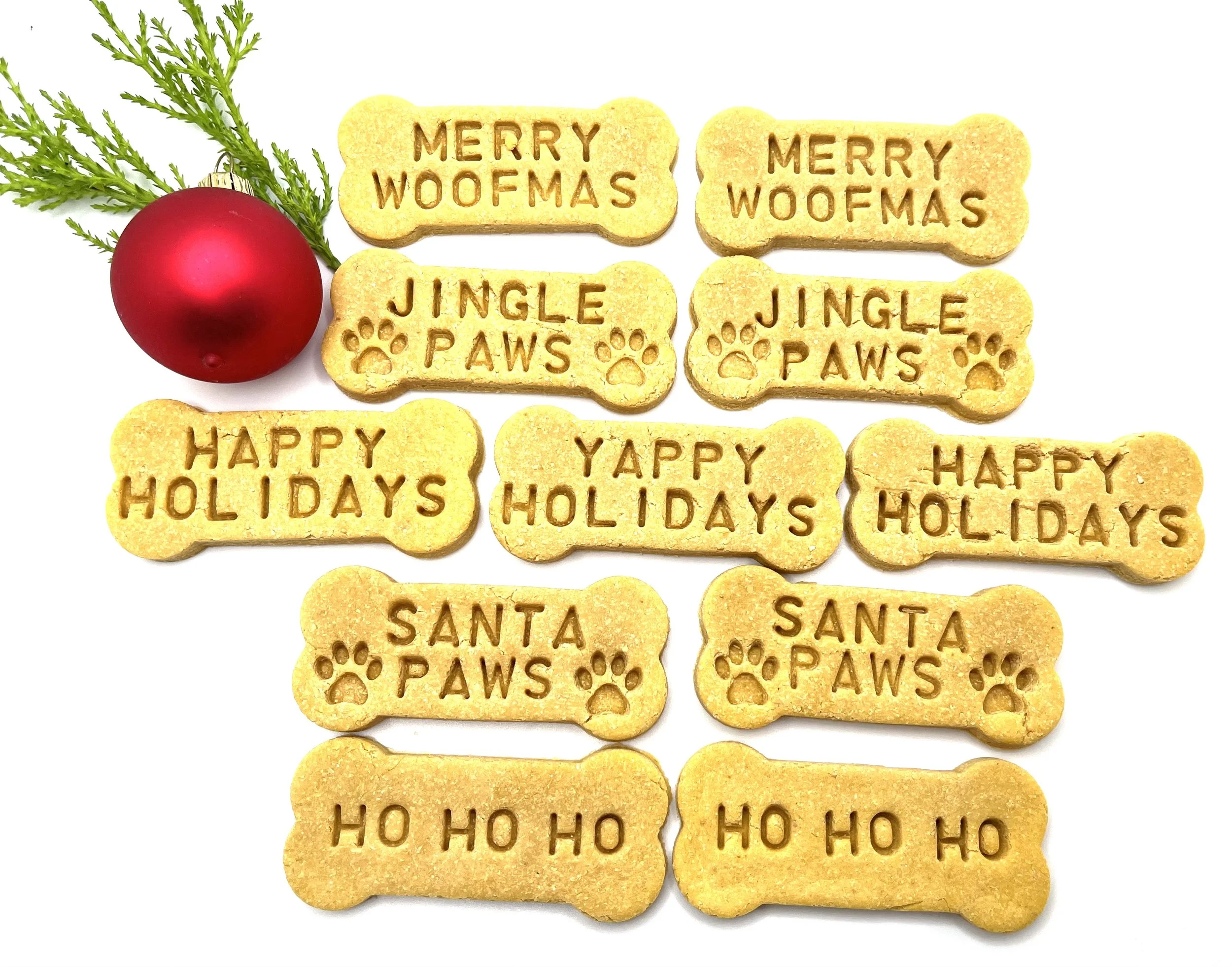 Holiday Christmas bones are made from my own healthy recipe and contain all natural ingredients with no preservatives or artificial colors. I custom make the order so you are guaranteed freshness. Fresh made roasted peanut butter, organic pumpkin and chickpea flour are combined in small batches. Treats are then individually stamped out and baked and deyhydrated for your dog to enjoy.
