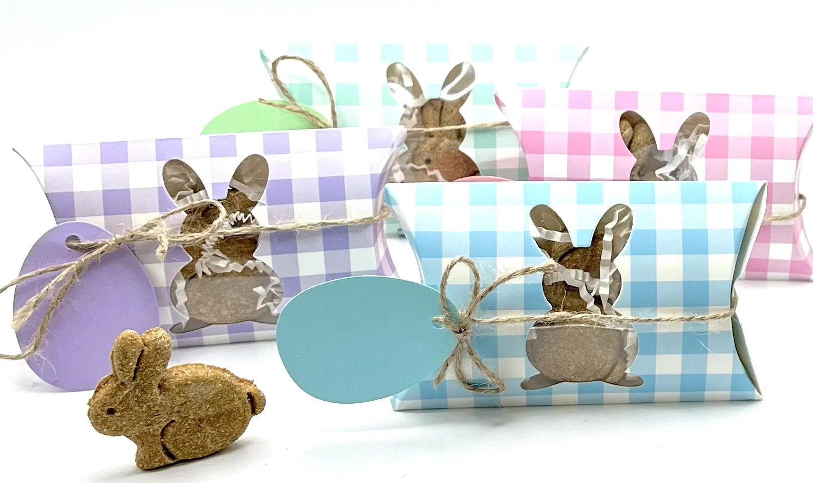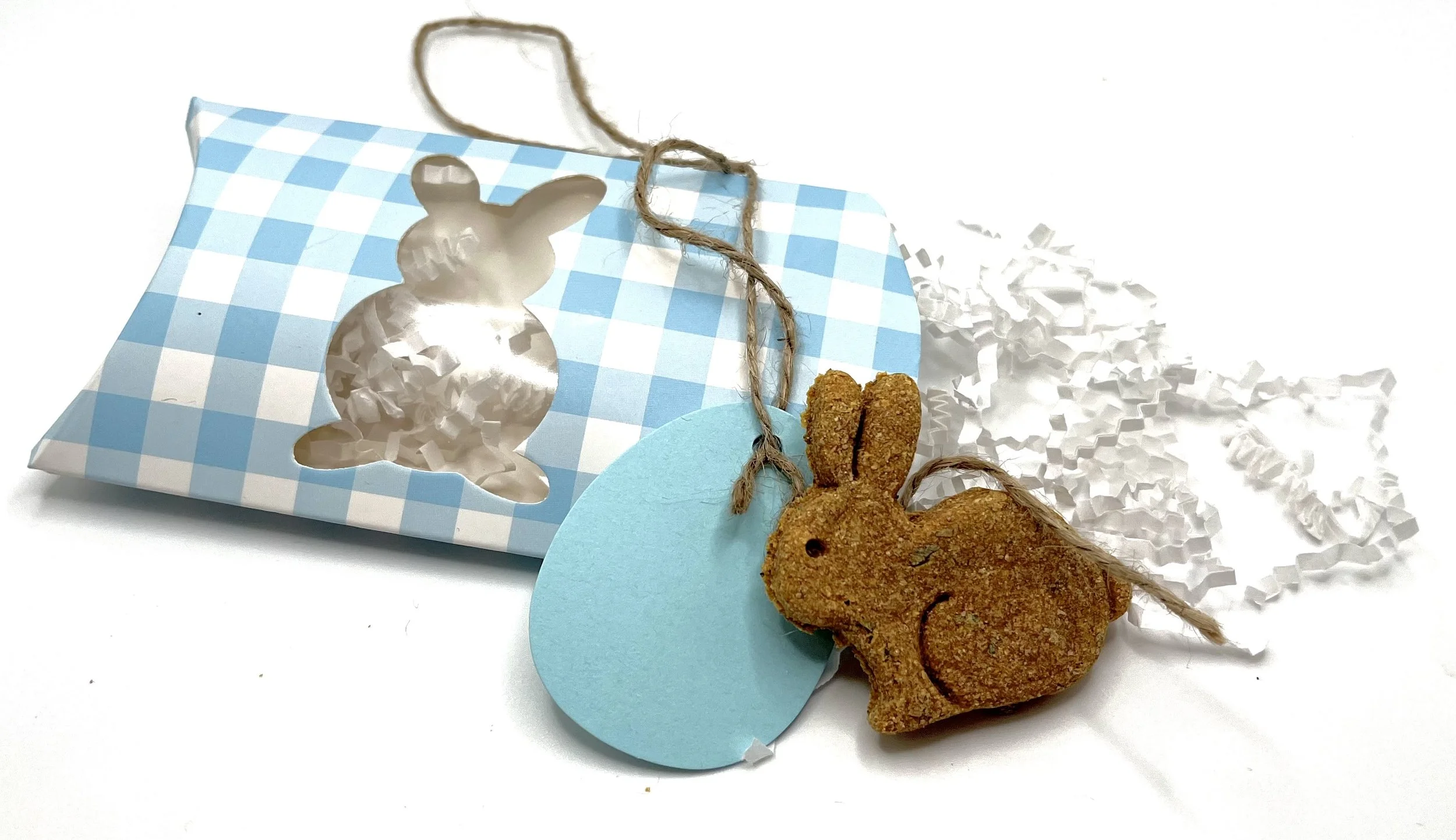 Each pillow box will contain a delicious crunchy rabbit biscuit. Each cookie is individually dehydrated and then packed in an adorable pillow box filled with colorful padding. Your guest will be so surprised and your dog's tail will not stop wagging!